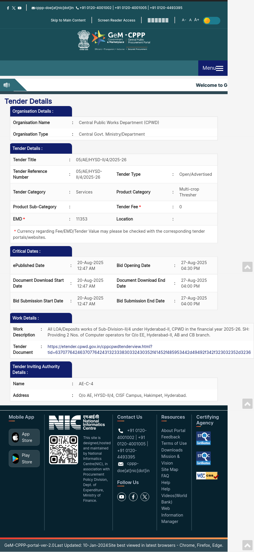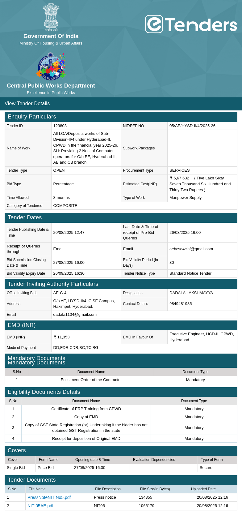 Description | : All Loa/Deposits Works Of Sub-Division-Ii/4 Under Hyderabad-Ii, Cpwd In The Financial Year 2025-26. Sh: Providing 2 Nos. Of Computer Operators For O/O Ee, Hyderabad-Ii, Ab And Cb Branch. |