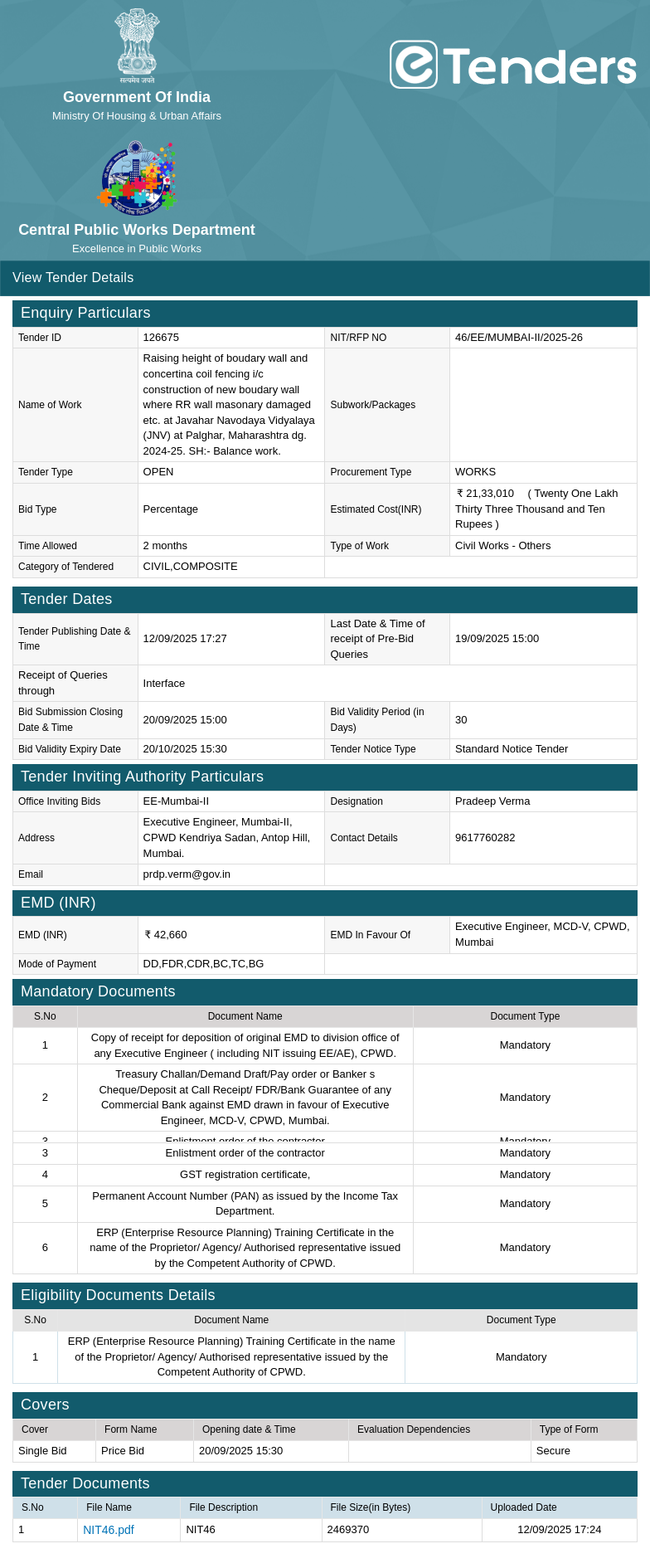 Address | : Executive Engineer, Mumbai-Ii, Cpwd Kendriya Sadan, Antop Hill, Mumbai. |