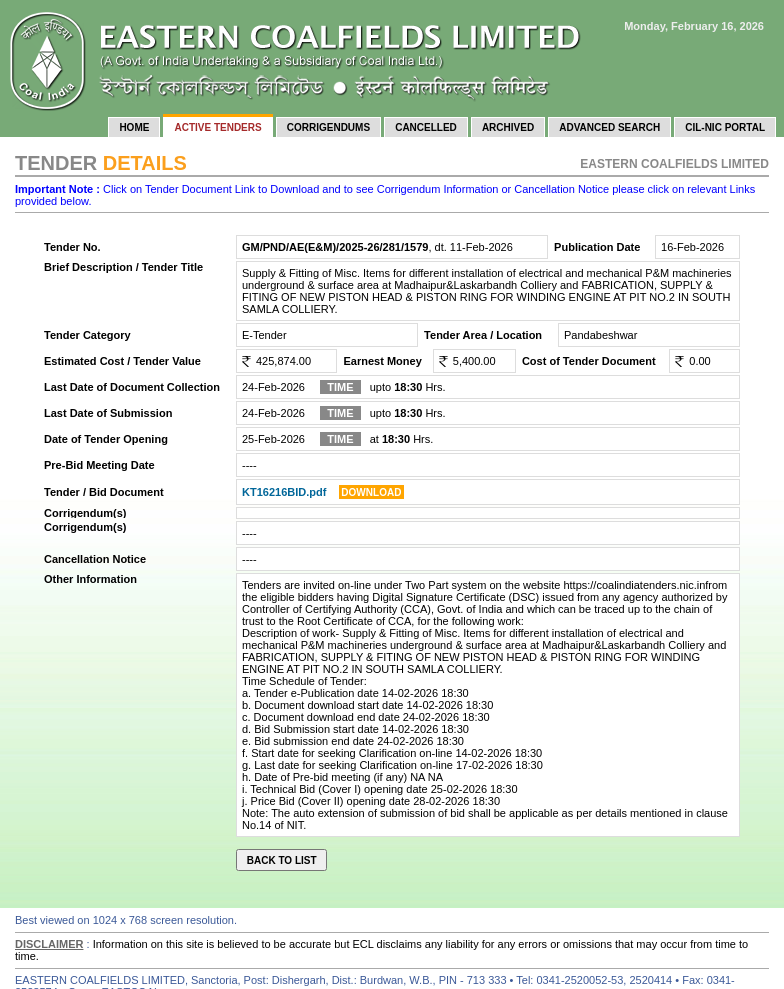 : Supply & Fitting Of Misc. Items For Different Installation Of Electrical And Mechanical P&M Machineries Underground & Surface Area At Madhaipur&Laskarbandh Colliery And Fabrication, Supply & Fiting Of New Piston Head & Piston Ring For Winding Engine At Pit No.2 In South Samla Colliery. At Pandaveswar, West Bengal |