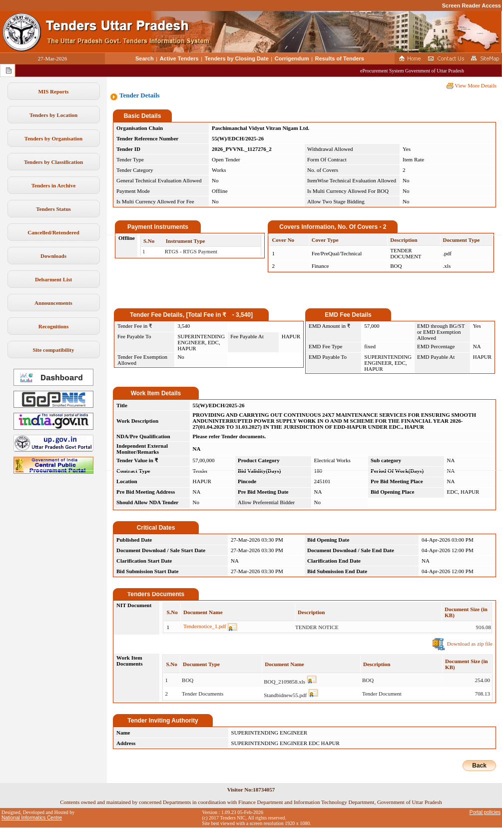 | Description | : Providing And Carrying Out Continuous 24x7 Maintenance Services For Ensuring Smooth Anduninterrupted Power Supply Work In O And M Scheme For The Financial Year 2026-27(01.04.2026 To 31.03.2027) In The Jurisdiction Of Edd-Hapur Under Edc., Hapur |