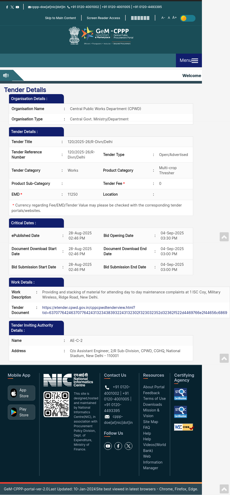 | Address | : O/O Assistant Engineer, 2/R Sub-Division, Cpwd, Cghq, National Stadium, New Delhi - 110001 |