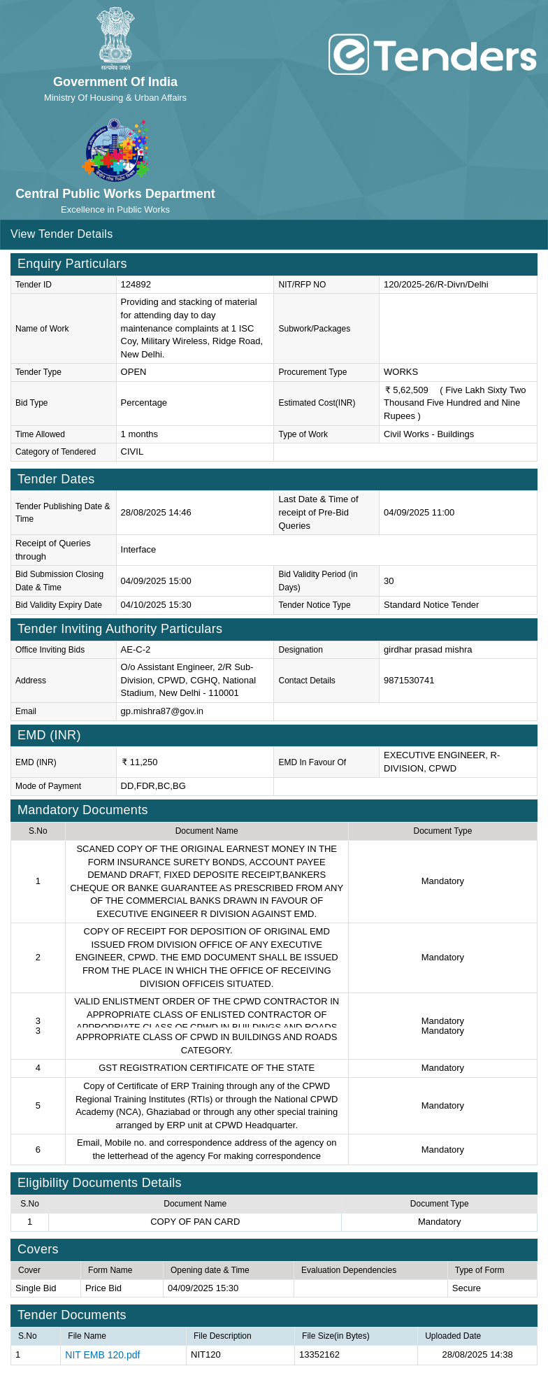 | Tender ID | : 124892 |