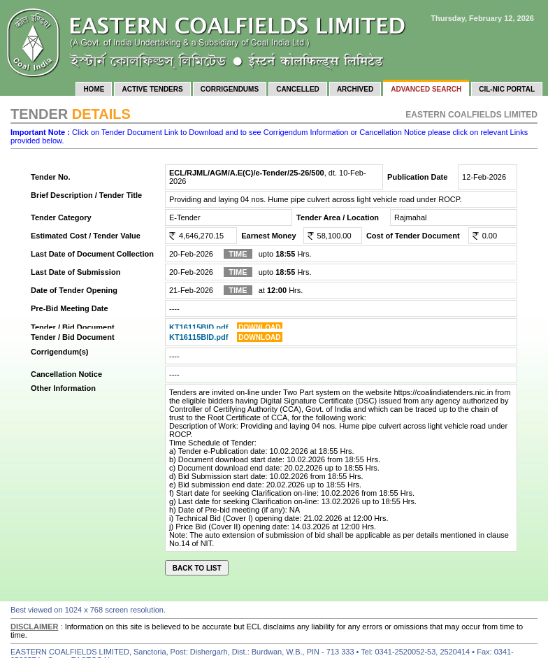 | Reference Number | : ECL/RJML/AGM/A.E(C)/e-Tender/25-26/500 |